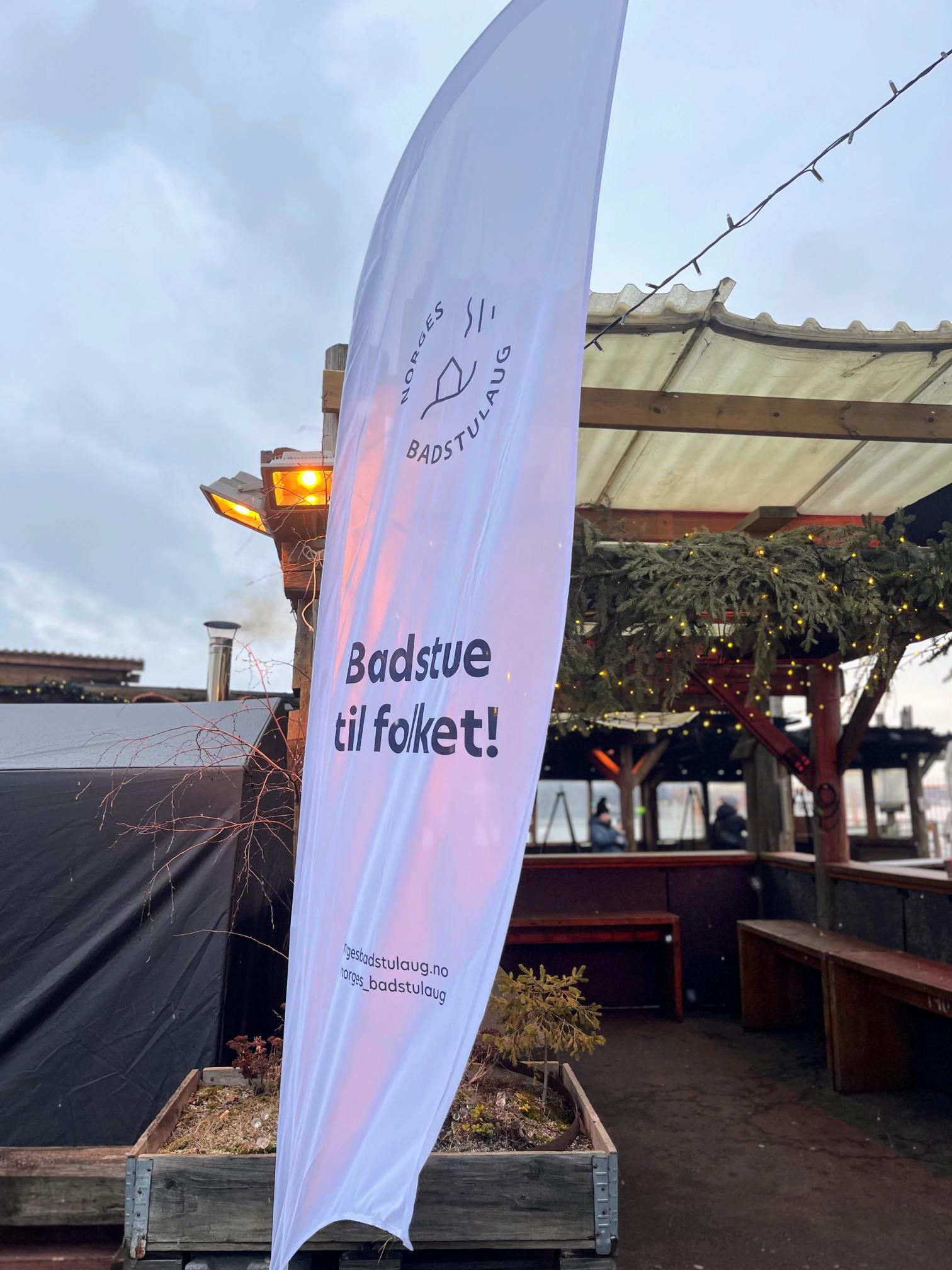 (Foto: Banneren til Norges badstulaug: Badstue til folket! Tatt på Badstukonferansen på Salt, Oslo, februar 2025)